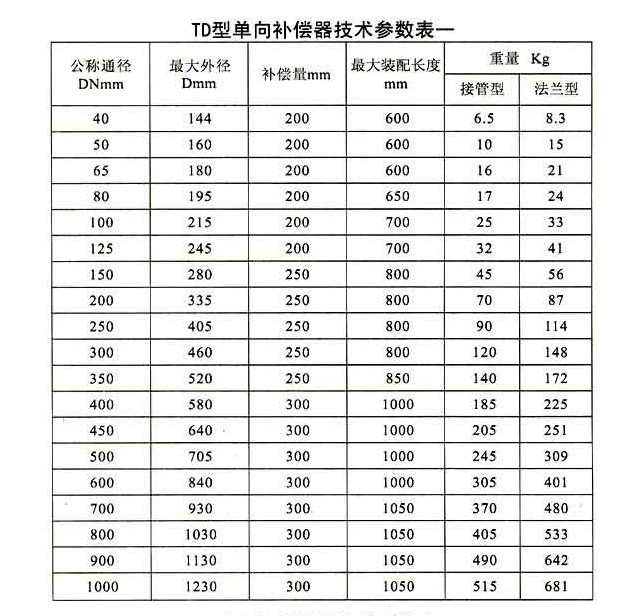1、TD型單向補償器技術參數(shù)見表1,結構型式見圖一。