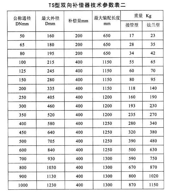 2、TS型雙向補償器技術參數(shù)見表2,結構型式見圖二。